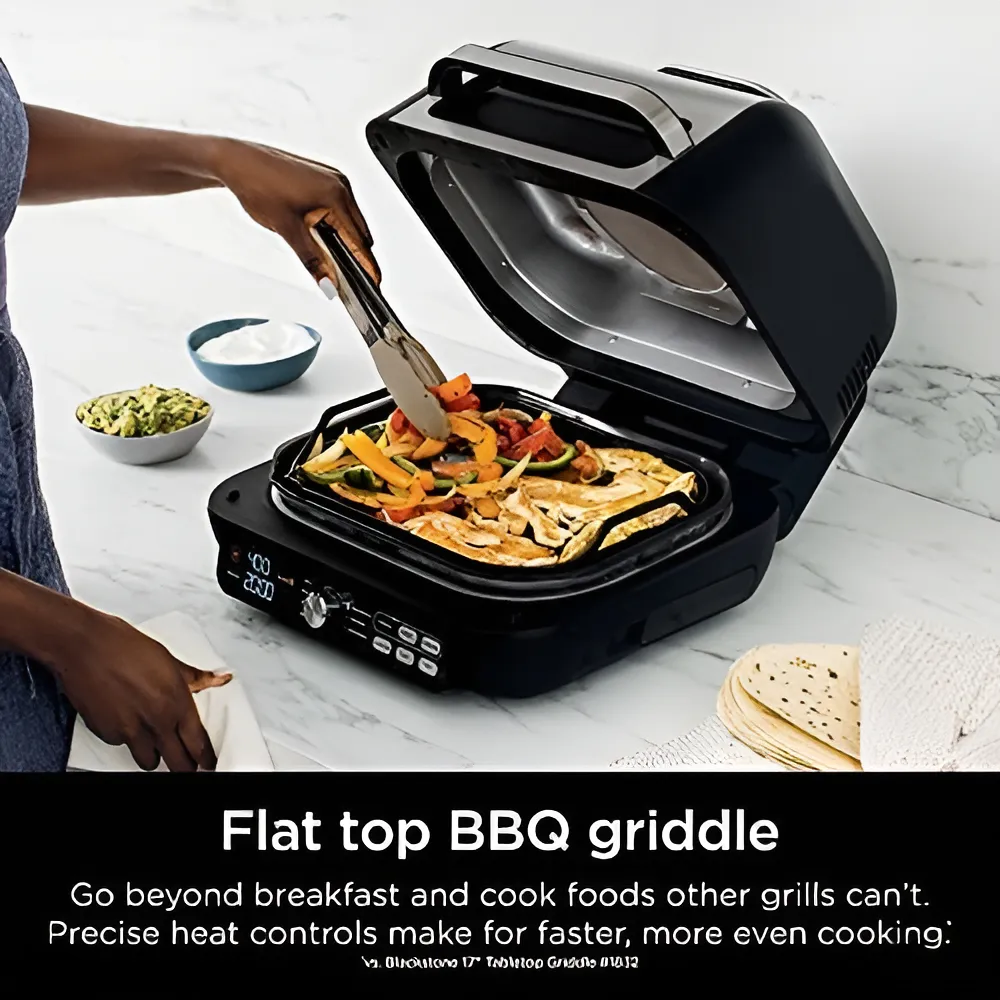 - Capacidad XL para la Familia: La espaciosa Rejilla de Parrilla puede albergar hasta 6 filetes o una comida familiar completa (platos principales y acompañamientos) a la vez. La Plancha BBQ de Tapa Plana es perfecta para panqueques, huevos o cuatro sándwiches.
