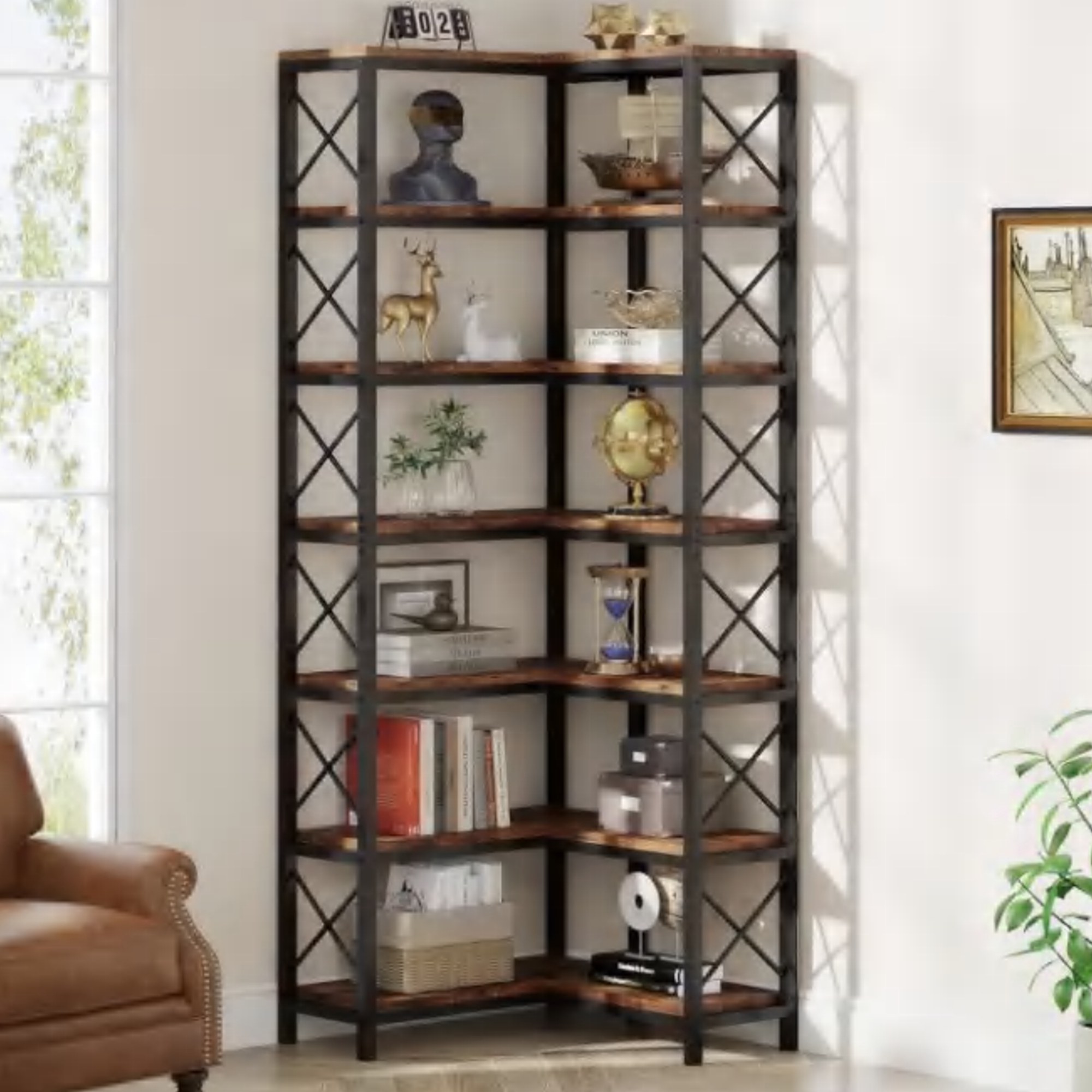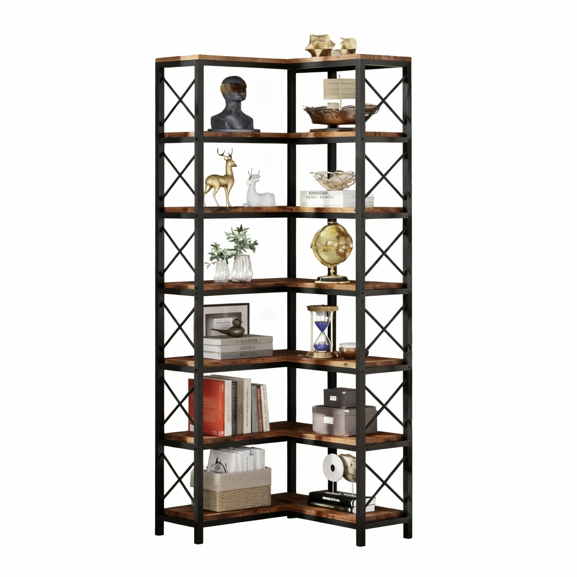 This tall bookshelf provides a large space to organize and display books, albums, collectibles, accent pieces, etc.A minimalist style with rustic brown panels, black steel and perfect symmetry, this contemporary corner bookcase will effortlessly blend into any home decor and bring a timeless charm to the interior.crafted from premium 12mm MDF and reinforced metal frame, this corner stand has a long service life for your books and collections to find a forever home. No smell, easy to clean, anti-toppling fittings, and adjustable feet help ensure maximum stability.