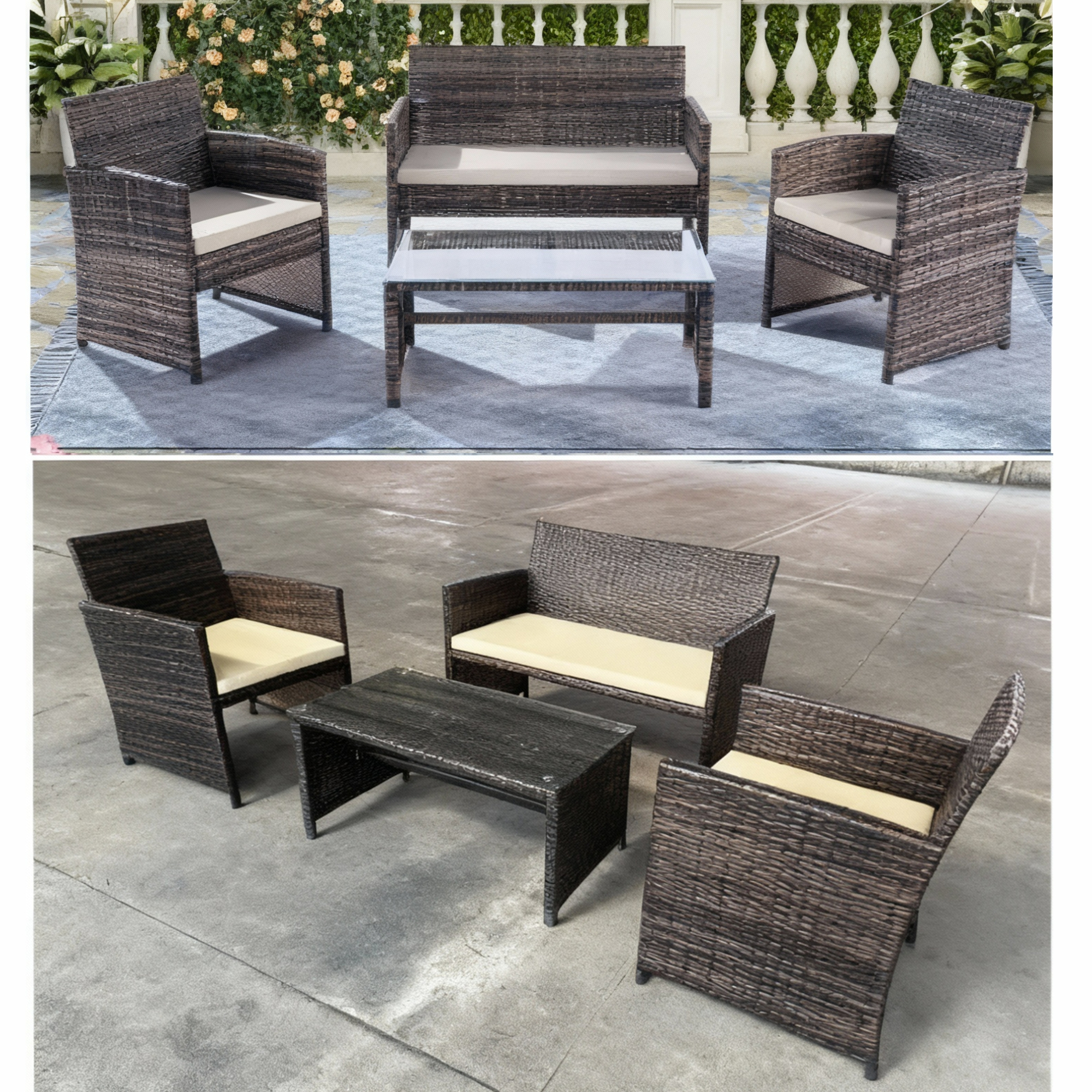 This 4 Piece Rattan Sofa Set with Cushions which includes a coffee table with glass top is very useful. It can not only make your outdoor life more comfortable but also make your garden more beautiful with its fashionable and modern style. It is made of rattan material and iron frame, which makes it sturdy and can serve you for a long time. Its seat cushions are really comfortable and they are easy to remove. It is convenient for you to clean. The coffee table with middle shelf is stable and provides you with enough storing space.