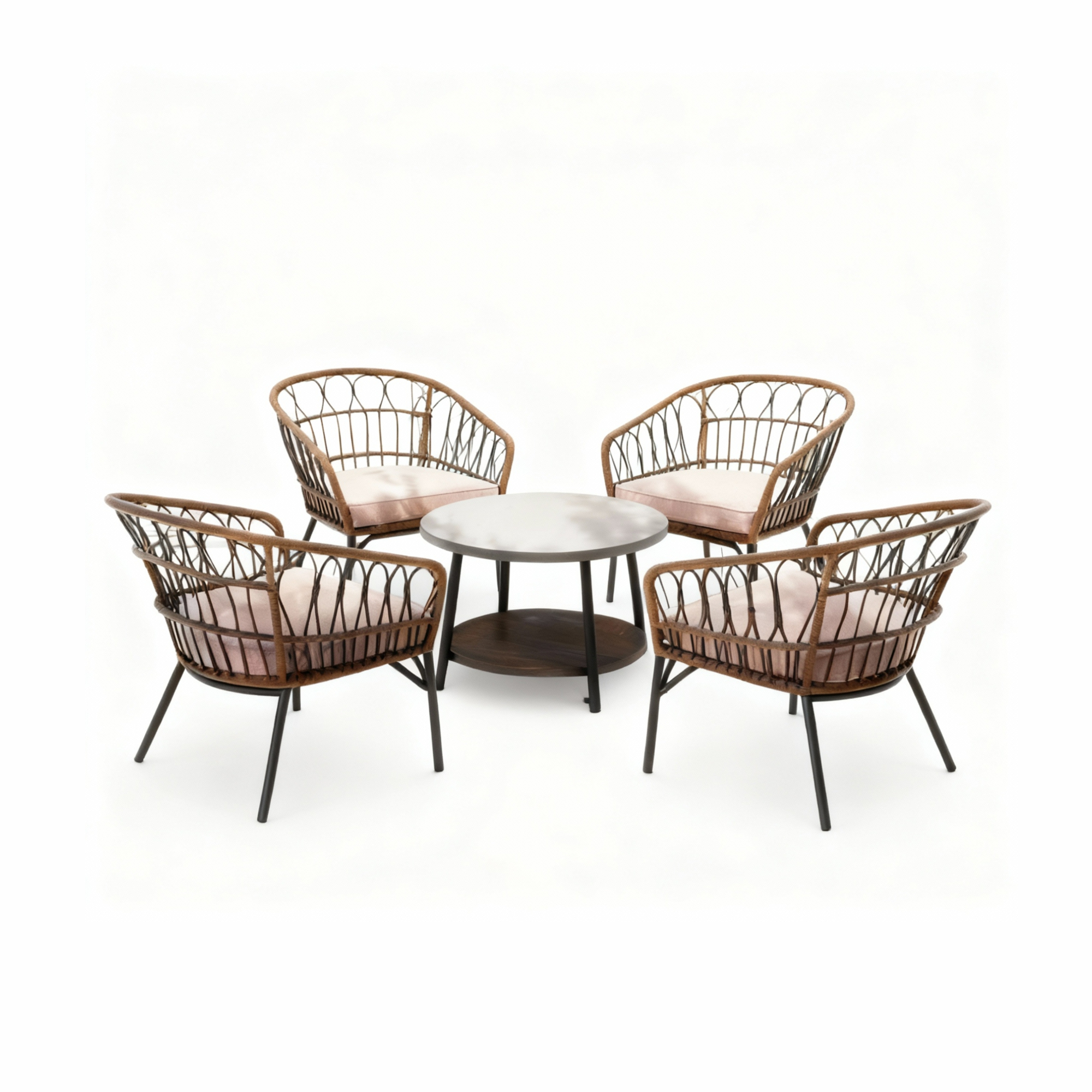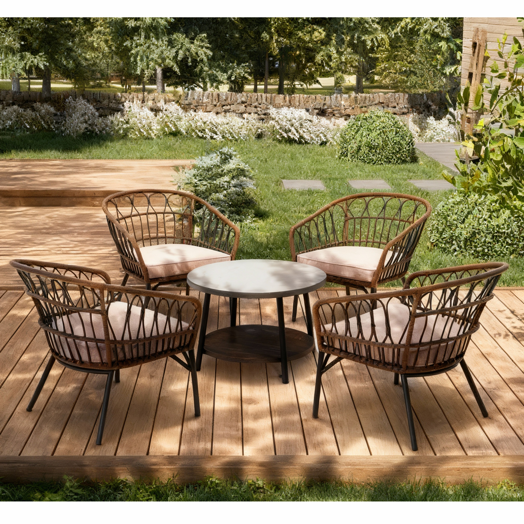 This bistro set includes four comfortable chairs and a round accent table, the ideal modern coastal style for your outdoor space.The wicker chair is equipped with a soft cushion made of Olefin fabric and 8cm thick foam to ensure a comfortable seating experience.This patio table offers two tiers, providing more space for storing books, serving beverages and snacks, or displaying small plants.