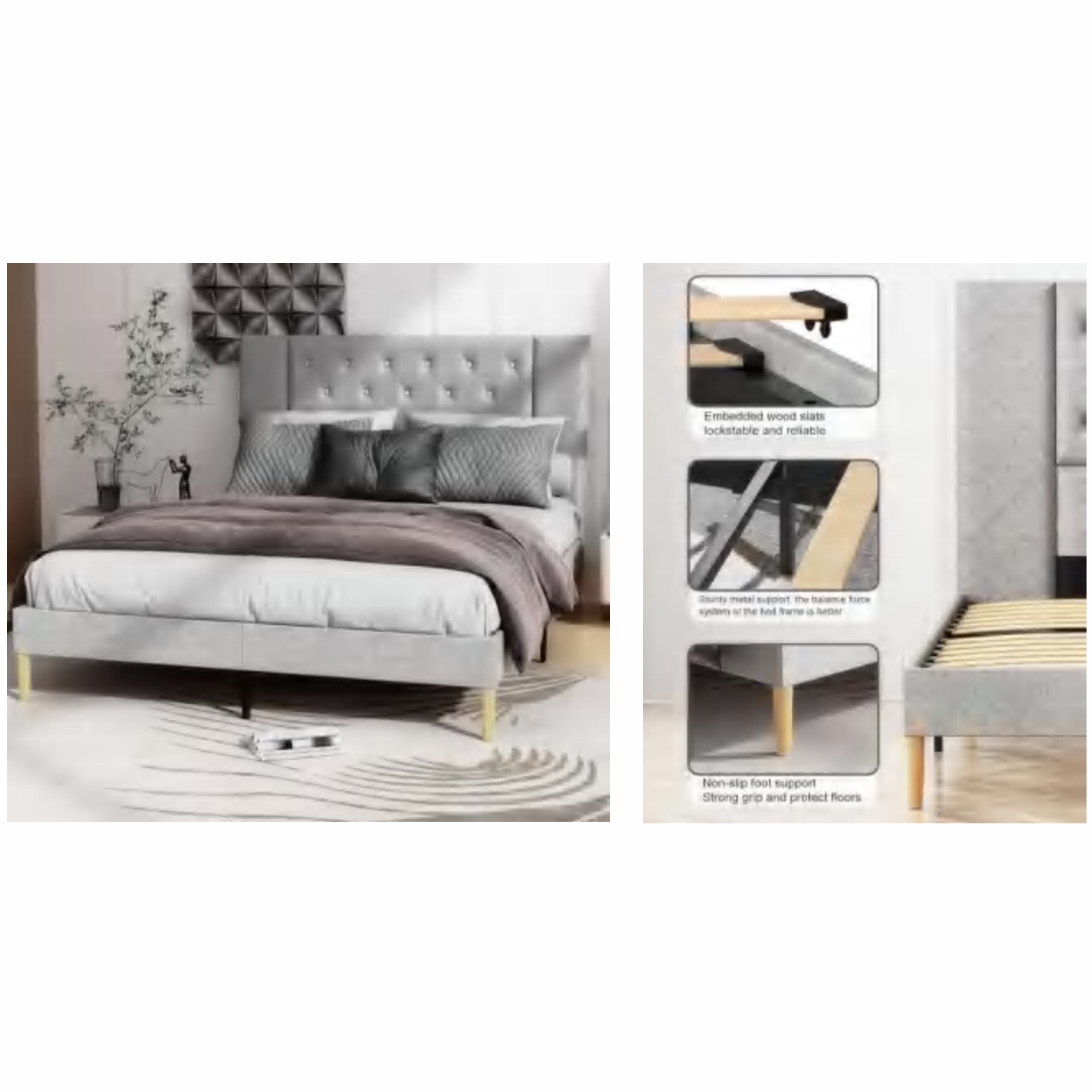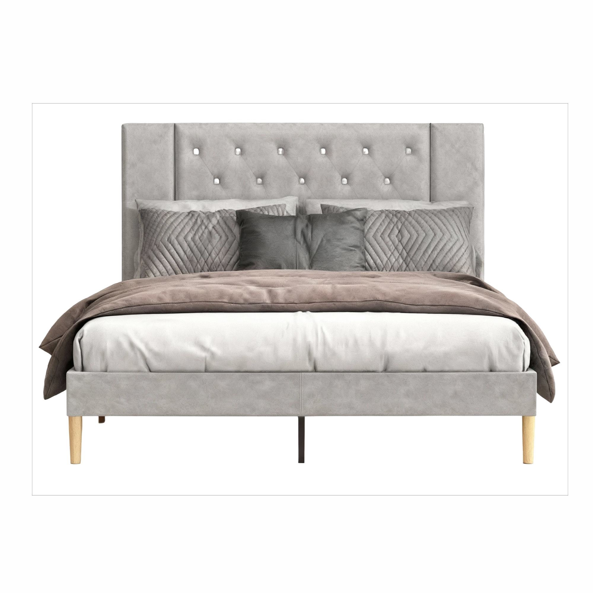 With the classic diamond button design and soft tufted headboard, the modern grey bed frame makes your bedroom more fashionable and exquisite. velvet fabric 15cm high plastic legs. The main structure of this bed frame is supported by widened metal, and the center part is supported by a solid structure of high-quality curved wooden bars.