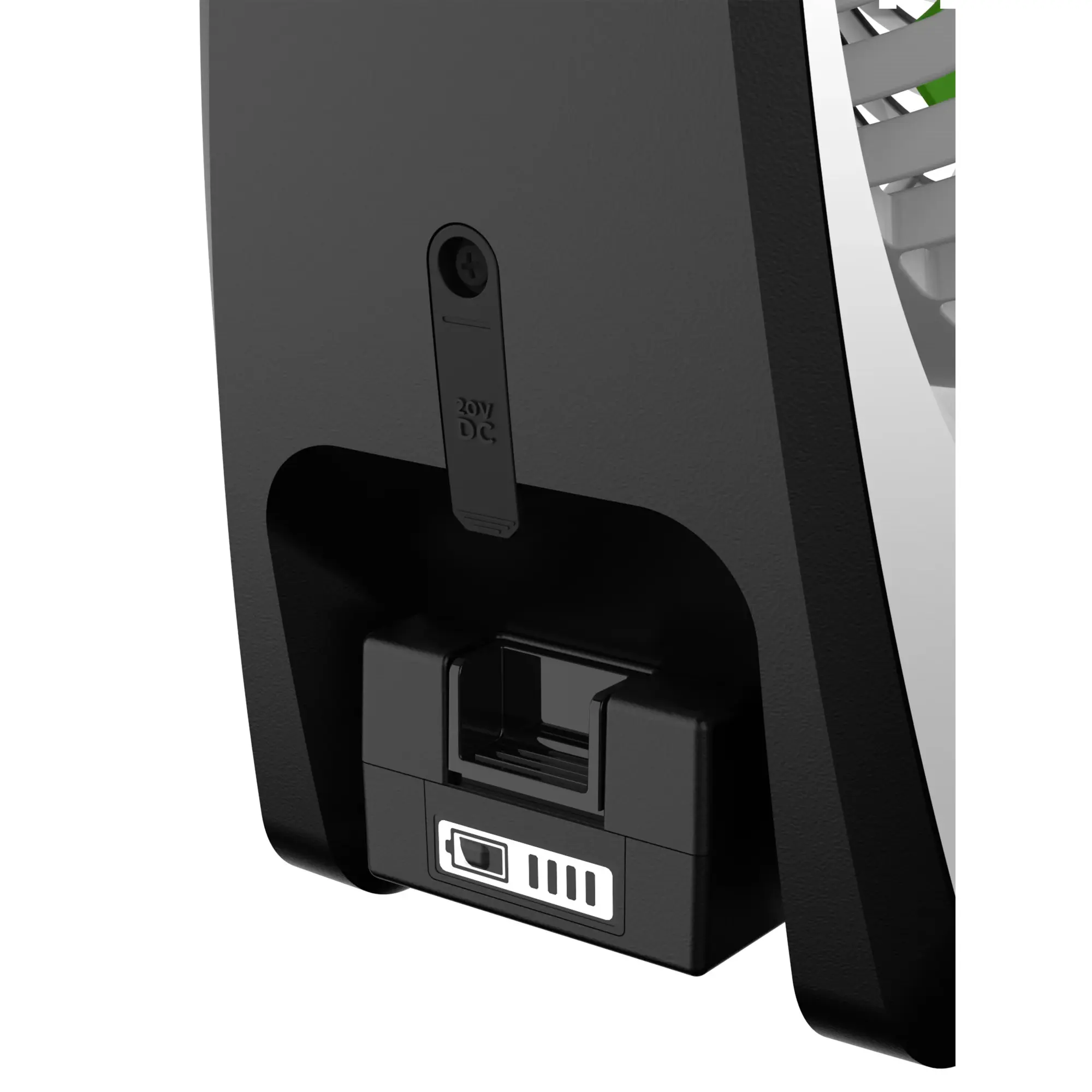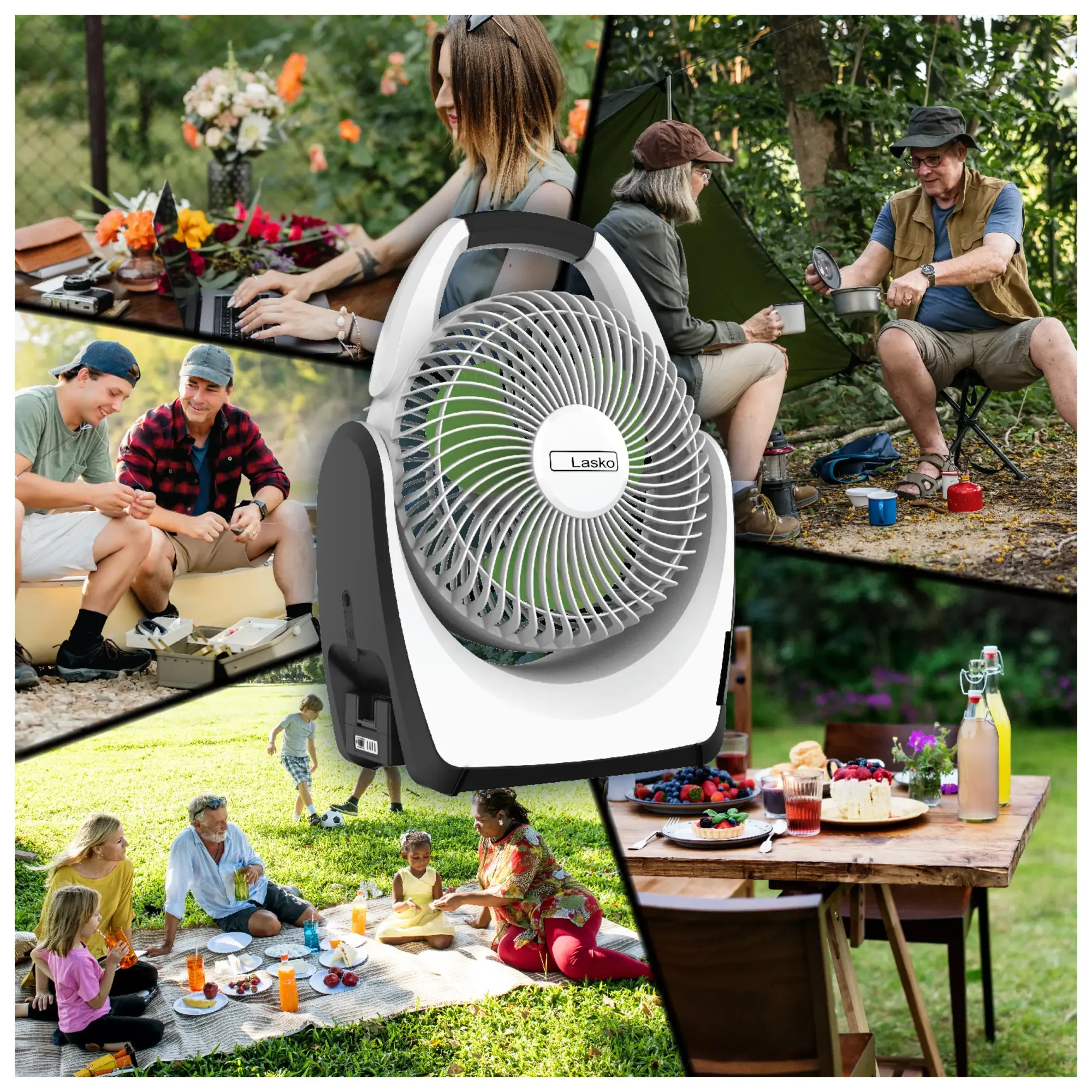 • Portable fan powered by an 18V rechargeable lithium-ion battery, ideal for outdoor cooling