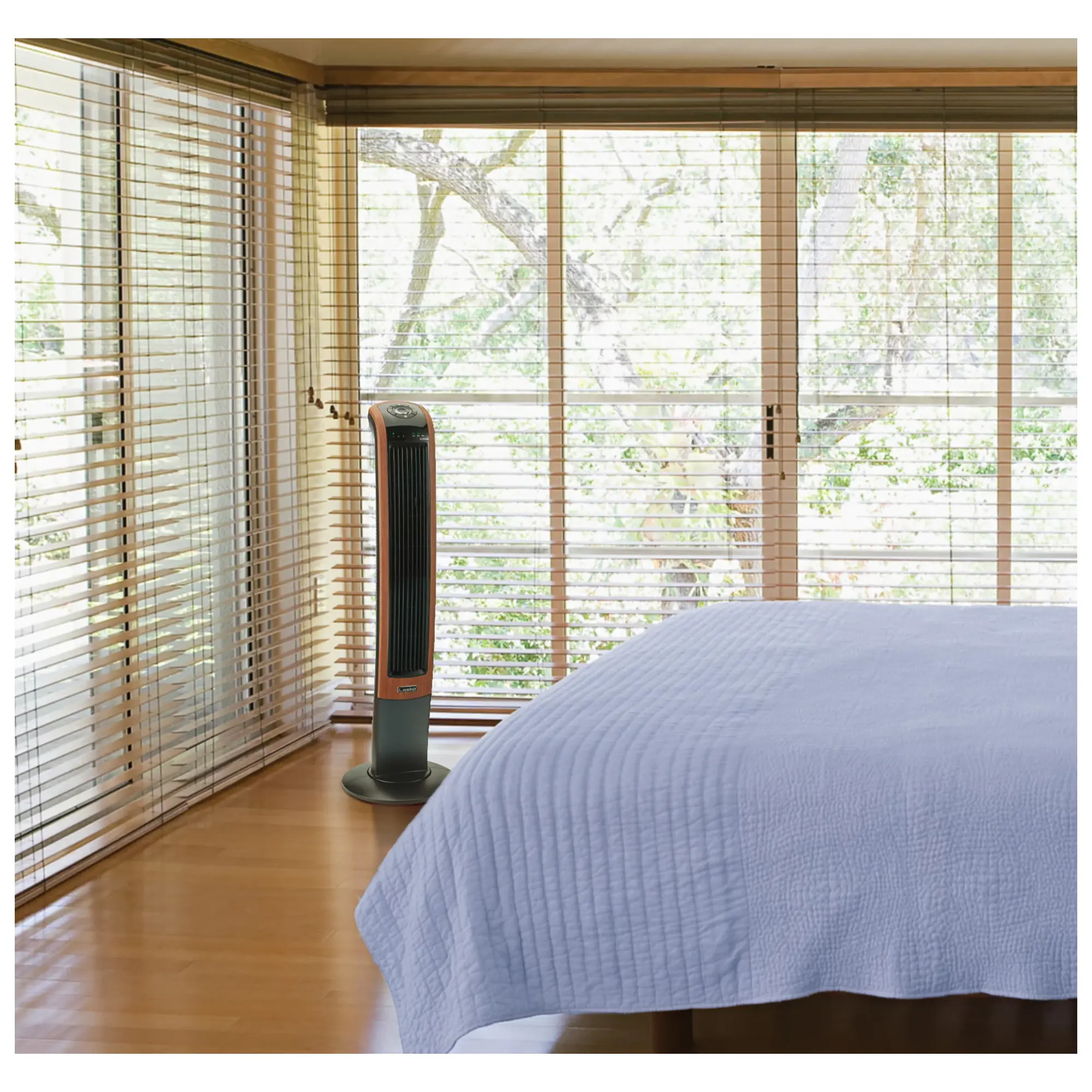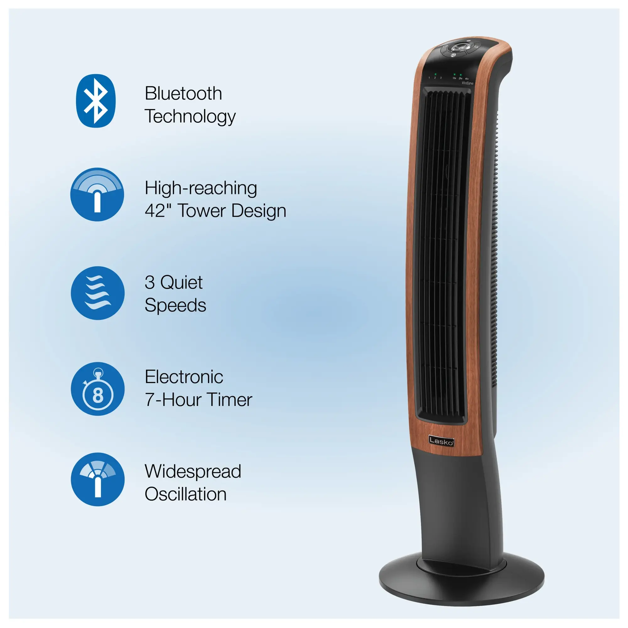Lasko 42″ Wind Curve 3-Speed Oscillating Tower Fan with Bluetooth® Technology, T42905, Woodgrain