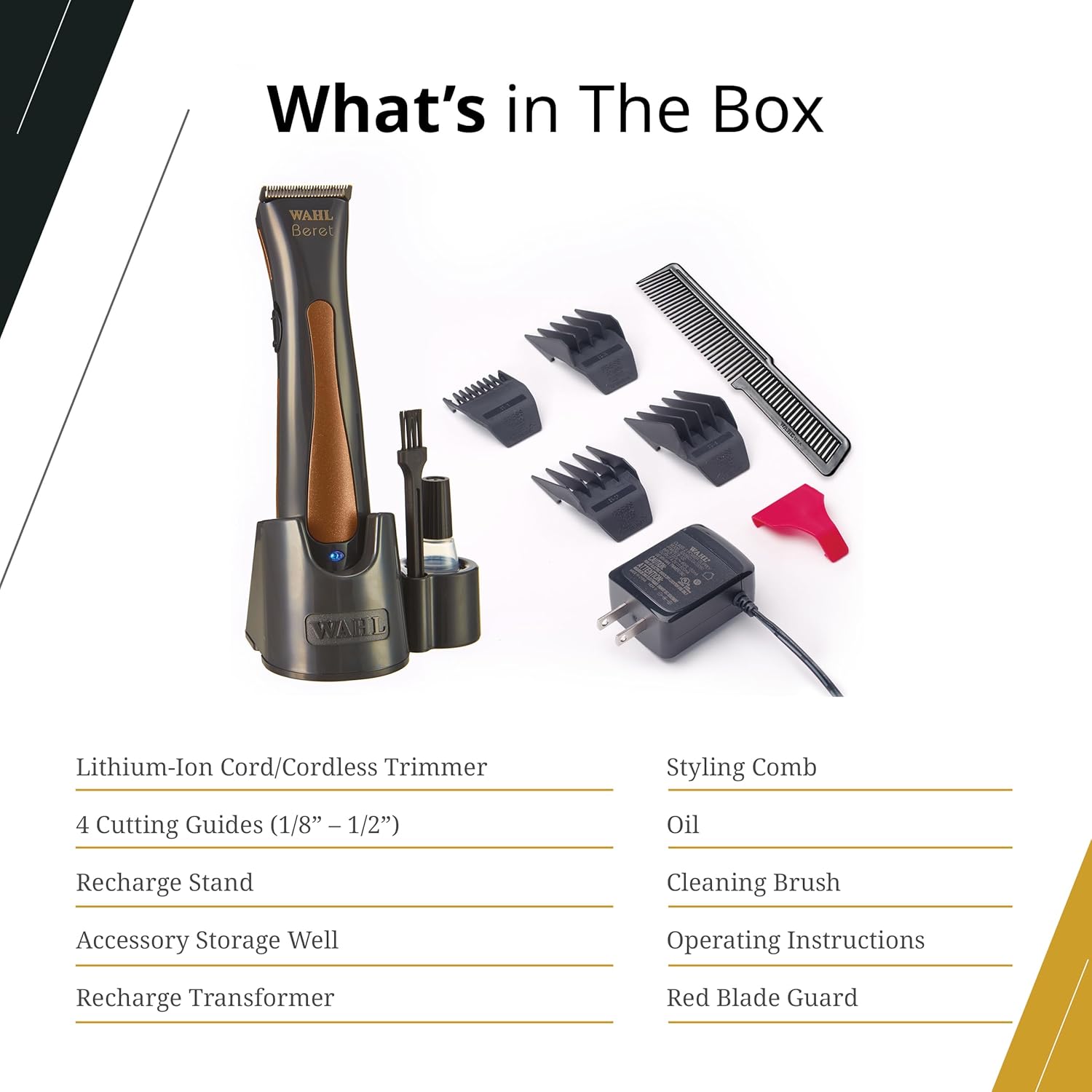 Ultra-quiet Wahl trimmer featuring a lithium-ion battery that provides over 120 minutes of continuous runtime, usable corded or cordless.